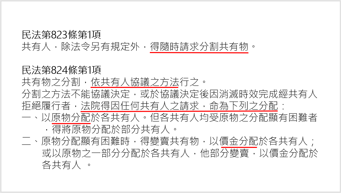 但如果該筆土地位於交通便利的精華地段,該應有部分土地的拍賣就會吸引少數特定人的青睞而進場投標,關鍵原因就在於民法第823、824條分割共有物的規定。