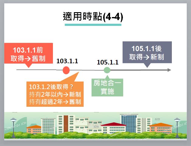 105.1.1後取得的房地產,出售時即適用新制;103.1.1前取得,不論出售時點均適用舊制;至於103.1.2至104.12.31之間取得的房地產,則以持有期間為標準,如持有期間超過兩年就適用舊制,但持有兩年以內就出售即採用新制。