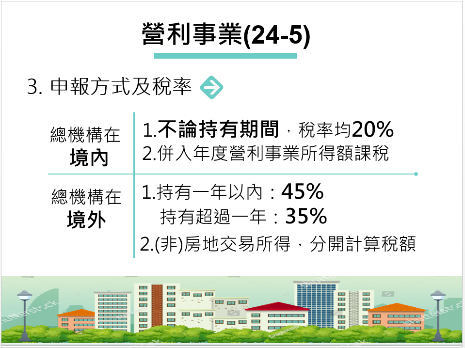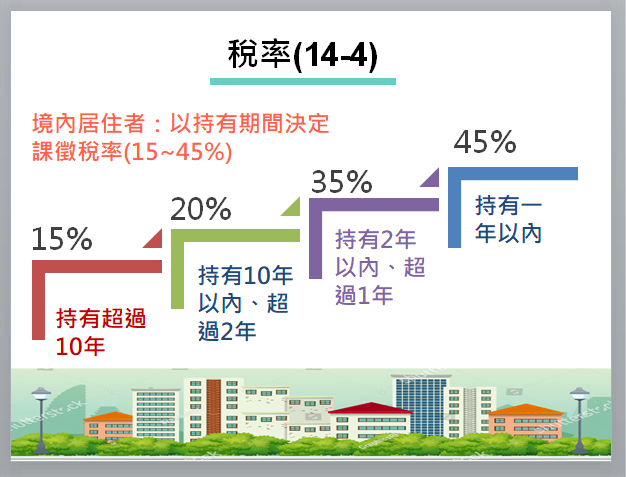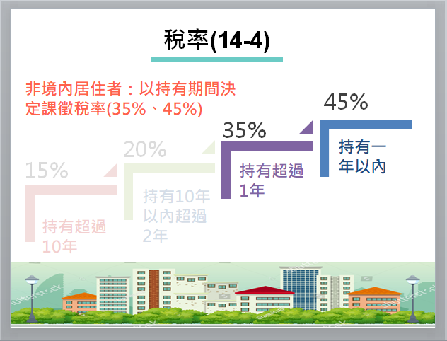 (2)境外營利事業的部分則跟境外居住者一樣,持有房地一年以內交易稅率為45%,持過房地超過一年交易稅率則為35%。