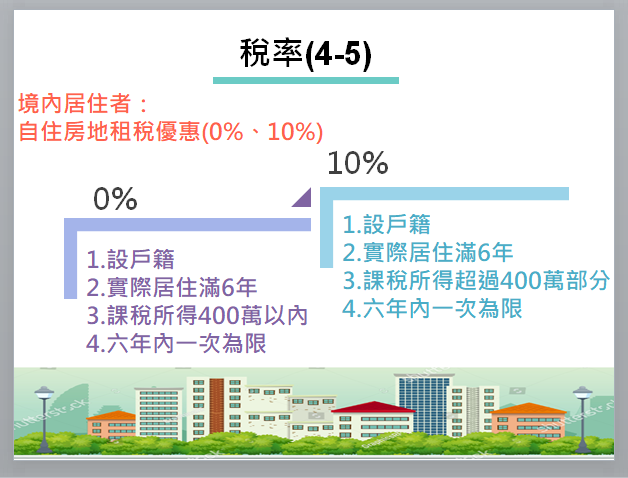 (3)另外針對自住房地的境內居住者,也就是如果就特定房地有設戶籍,實際居住滿六年,課稅所得400萬以下,近六年來沒有適用過該租稅優惠的情形,甚至可以免稅,如果課稅所得超過400萬元,400萬以內還是免稅,只針對超過部分課徵10%稅率。