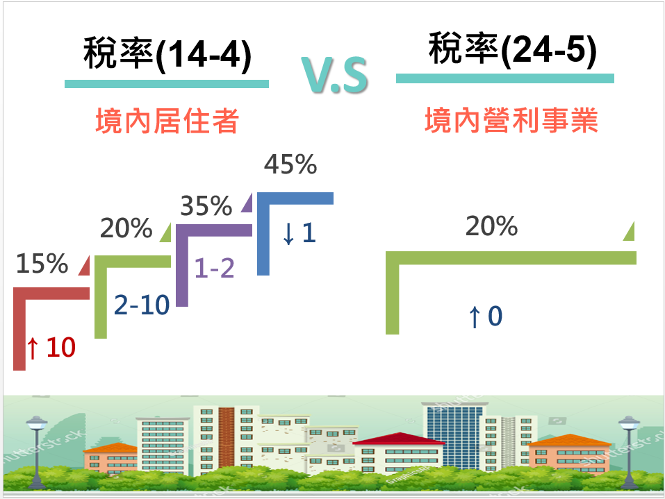 (1)就個人的部分,新制區分為境內居住、境外居住,並就境外居住之個人(注意,此處僅以「居住處所」為標準,不論國籍),適用較高的稅率。