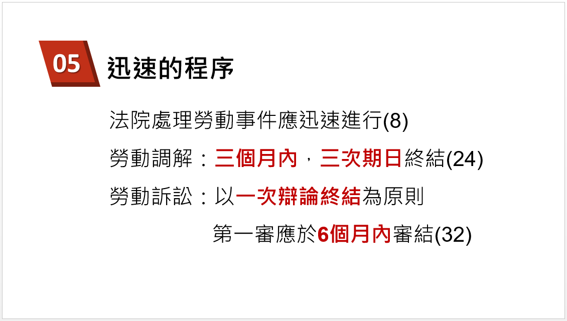 因此勞動事件法規定,法院處理勞動事件應迅速進行,勞動調解程序必須於三個月內,以三次期日終結;勞動訴訟則以一次辯論終結為原則,第一審應於6個月內審結(8、24、32)