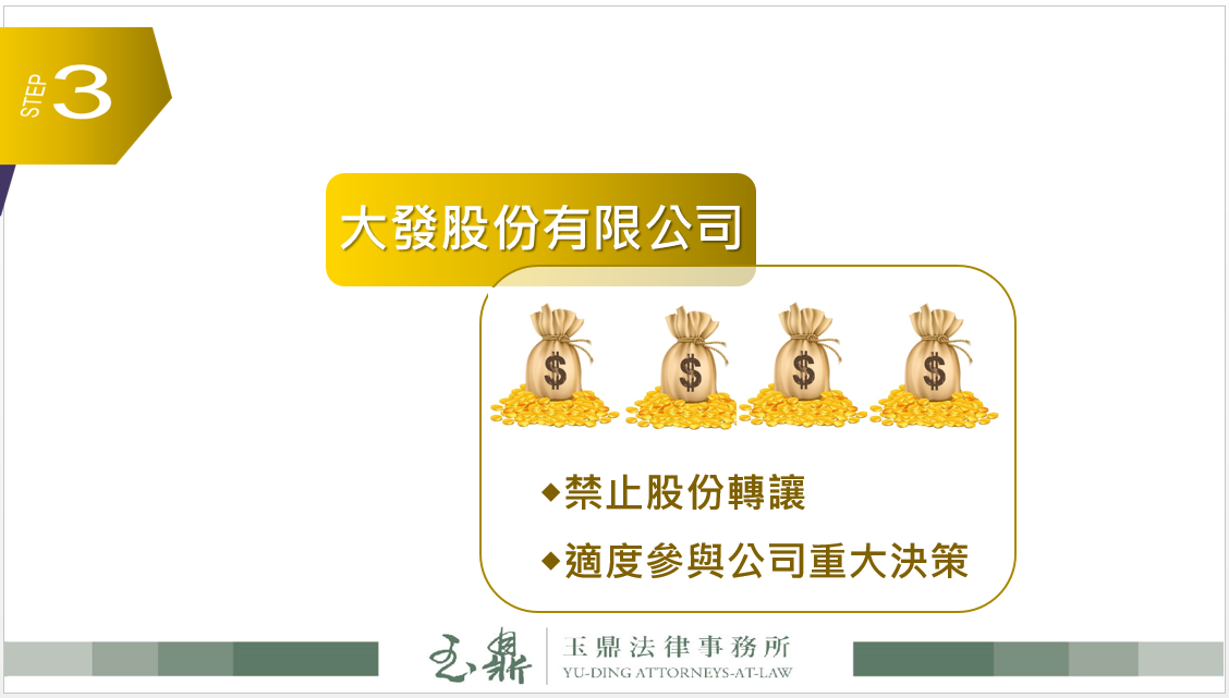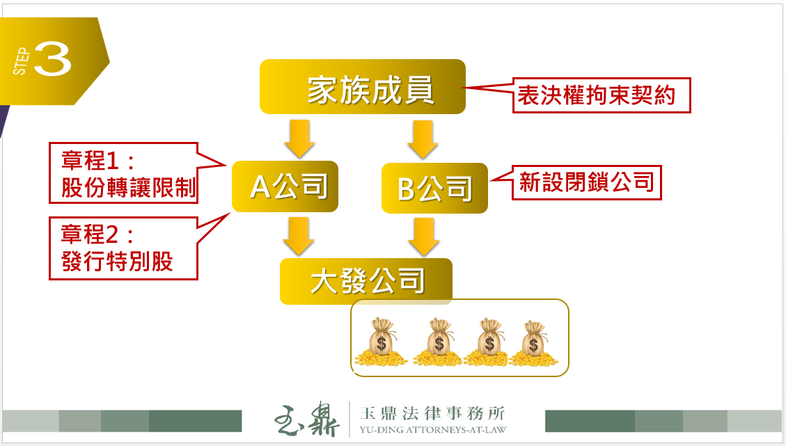 也就是另行成立A、B兩家閉鎖公司,再將大發公司股東從原本的家族成員變更為A、B公司,大發公司股份全部改由A、B公司持有,家族成員則改持有A、B公司的股份。因A、B公司是閉鎖公司,依照章程規定可嚴格限制股東僅得於特定條件下始得轉讓股份,否則轉讓無效。個別家族成員股東不持有大發公司股份,而持有的A、B公司股份卻無法出售,自然可有效減少大發公司經營權外流的問題,至此王董希望禁止股份轉讓的第一個想法就完成了。
