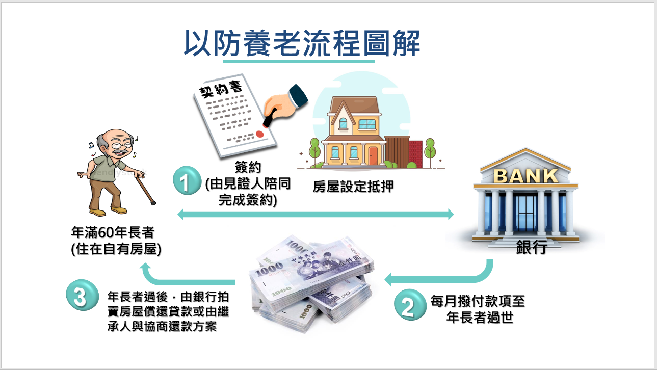 以房養老貸款,正式名稱為「商業型不動產逆向抵押貸款」,是政府考量許多60歲以上的年長者除了年輕時打拼買下的房子以外,手邊沒有多餘的存款及財產,子女也因收入有限無法扶養,因此為提供年長者經濟保障,由年長者將自己的房子抵押給銀行(目前主要為公股銀行),由銀行評估房子價值、預期壽命等因素後,按月給付年長者生活費,房子仍然屬於年長者所有,年長者也可繼續居住在自己的房屋直至終老,這樣不僅可減輕子女扶養負擔,也可使年長者有足夠的現金流,可以支付日常醫療、照護費用及雜支開銷,讓退休生活更有品質與保障。在年長者過世後,子女或繼承人則可與銀行協商償還貸款,或由銀行處分該房子受償。