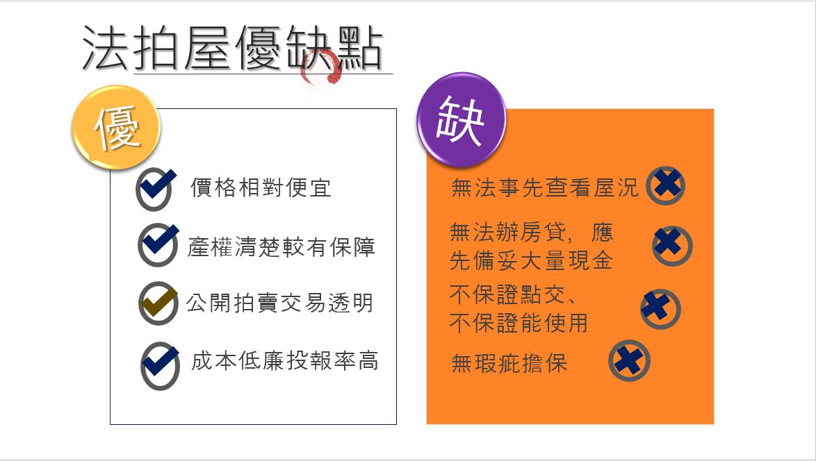 因為法院拍賣會一直減價,所以價格通常比市價低,至於其他優點的部分應該看圖就懂了。缺點的部分比較重要,因為房屋還在債務人名下,所以一般人無法進入查看屋況,買了之後可能要大幅整修,這也是法拍屋價格比較低的原因之一。另外法拍屋最困難的地方,在於投標時就要先投入2成保證金,得標後還需在7日內補足8成尾款,許多銀行又不承辦法拍屋代墊款的業務,常有民眾因為短期內籌不出8成尾款,而保證金被沒收的案例,這對一般民眾都是一筆不小的負擔。而且有的法拍屋得標後,房屋被人占用、破壞,得標人不僅無法使用,還必須另行訴訟或付一筆搬遷費,才能把霸佔房屋的人請走。最後則是買到的法拍屋就算再破、再爛,依法都不能請前屋主或法院賠償,只能自己默默花錢整修,這些都是法拍屋讓一般民眾望之卻步的原因。
