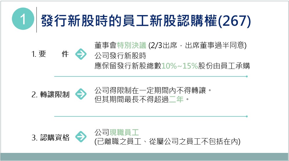 首先是員工新股認購權,探討一個制度,其實應該從法律規定的條文開始看起。但為了避免貼一堆文謅謅的法律條文嚇跑大家,我在這裡把公司法的條文濃縮,以重點條列的方式做成圖表,這樣相較於拗口的條文,應該可以有效減少大家閱讀的困難。