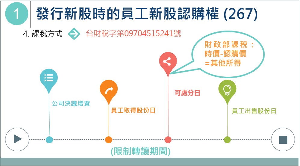 依財政部函釋,員工於承購公司發行之新股後,在限制轉讓期間因員工尚無法自由處分,因此這段期間股份價格不論如何飆漲,員工實質上既然未獲有利益,股份價值的差額自然不列入個人所得加以課稅。但於限制轉讓期間經過後,員工就可以自由處分或轉售賺取價差,此時如員工持股的時價超過當初認購價格,差額部分就屬所得稅法第14條第1項第10類規定之「其他所得」,應計入該年度員工之所得額,公司應向國稅局申報、填發免扣繳憑單,依法課徵員工所得稅。