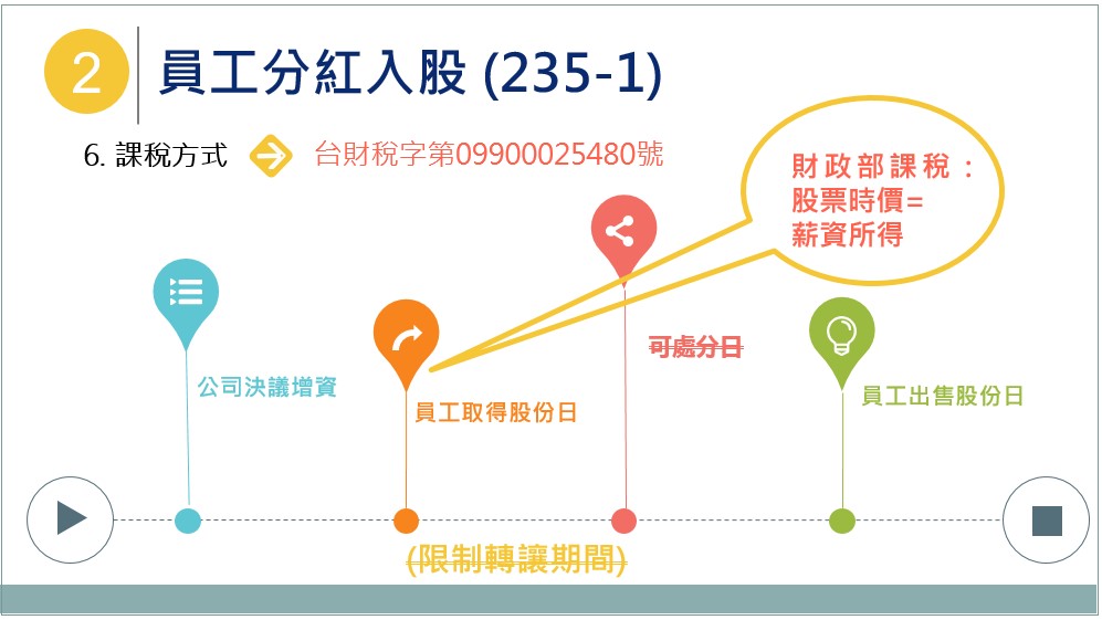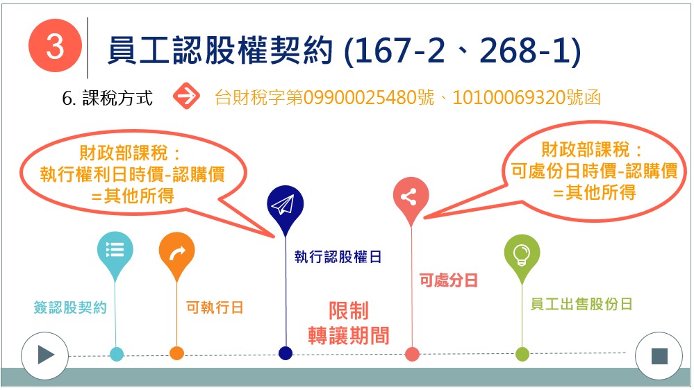 如上所述,員工執行認股權契約後,公司轉讓股份予員工的方式有大股東轉讓持股、增資發行新股、庫藏股等三種方式。依財政部函釋,課稅方式則因員工取得之股份是否有限制轉讓期間之不同,而有不同之課稅時點。