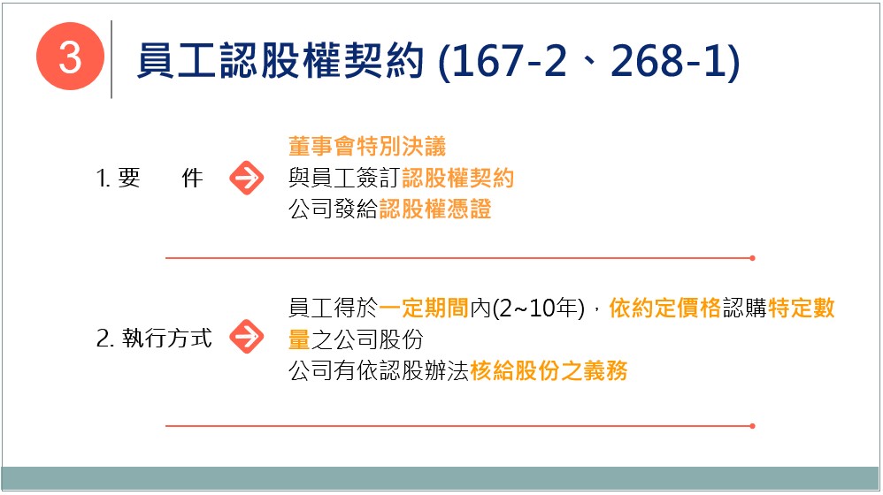 員工認股權契約是目前許多公開發行公司採用的制度,也就是經公司董事會特別決議後(董事2/3以上之出席及出席董事過半數同意),由公司與員工簽訂認股權契約,約定於一定期間內(通常為2~10年),該員工得依約定價格(不得低於發行日)認購特定數量之公司股份,訂約後由公司發給員工認股權憑證。