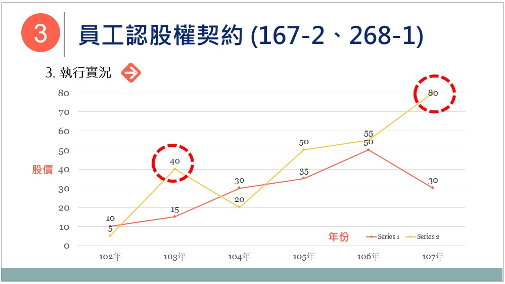 舉例而言,如大發公司於102年推動員工認股權證計畫,經董事會特別決議後發行認股權憑證給特定績優員工,認購價格為每股10元,取得認股權憑證的員工,即享有於往後2~10年間,不論當時公司股份市值,均得以每股10元的價格向公司購買股份的權利。以黃色線圖為例,取得認股權憑證之員工不論於股價市值為40元或80元,均得以每股10元向公司認購特定數量之股份,進而賺取高額之差價。