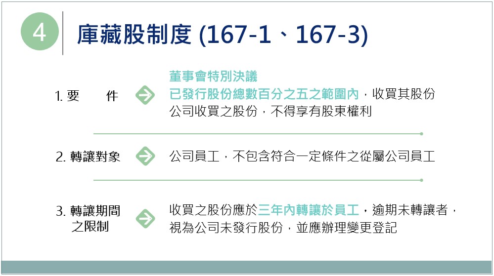 第167條之1規定實施庫藏股,屬公司自治事項,不需向主管機關申報,因此經董事會特別決議後即可實施,程序相對簡便。且公司買回後三年內任何時間均可轉讓予優秀員工,增加制度運用之彈性,於價格較低時買回更可降低買回成本。