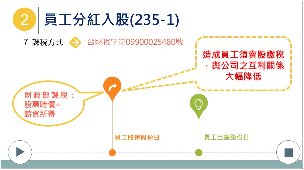 不知道各位讀者看完前2篇介紹後有沒有這樣的疑問,以員工分紅入股為例,財政部是以員工取得股份日作為課稅時點,但員工取得股份後未必會馬上出售持股,該取得之股份價值卻已經計入員工該年度的所得,而須於隔年5月繳交所得稅,換言之,員工取得之股份價值越高,隔年所需繳納的稅額越高,如該員工手邊資金不足,勢必得出售持股以繳納高額稅金,這樣的課稅方式形同逼迫員工於取得股份後,隔年馬上賣股繳稅,這樣原本希望藉由發放股份給公司重要員工,使員工個人利益和公司利益一致、與公司利害與共的制度本旨,不是顯然背道而馳嗎?