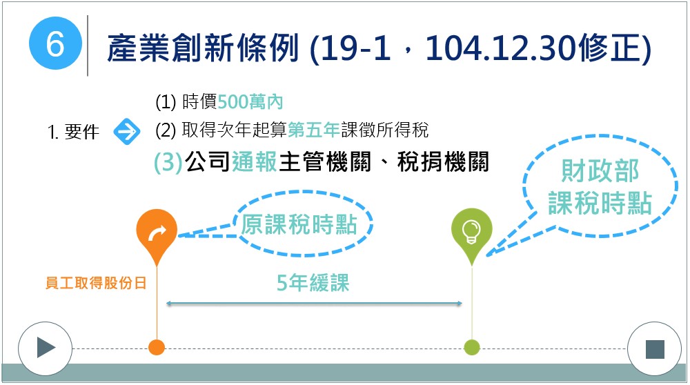 為了避免這樣的情況,立法院於104年12月30日通過產業創新條例第19條之1的修法,主管機關亦隨即於105年9月6日頒布「個人或公司適用產業創新條例延緩繳稅及緩課所得稅辦法」,明定公司獎酬員工之股份,於員工取得股份當年度或可處分日年度之時價500萬元總額內,員工得選擇免予計入當年度應課稅所得額,應繳稅額可全數延緩至取得年度次年起之第五年再課徵所得稅。在這樣的規定下,員工即不需再為了繳納高額稅款而立即處分持股,而可將繳稅義務延緩五年,有效減低員工納稅之負擔。而為了讓員工享有五年緩課所得稅的優惠,公司則應依規定格式填寫相關文件,送請向各中央目的事業主管機關備查,並副知公司所在地之稅捐稽徵機關,員工才能夠適用緩課所得稅的優惠。