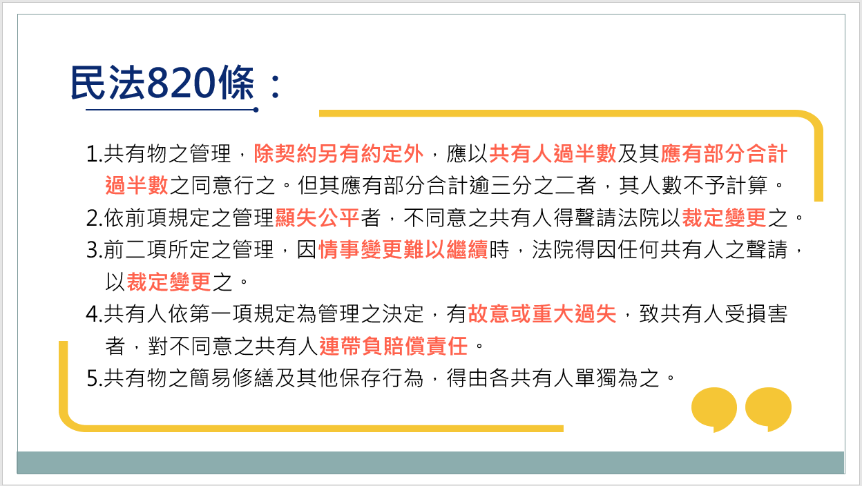 上篇解說後,在了解民法第820條共有物管理的規定後,我們回到本案例的問題: