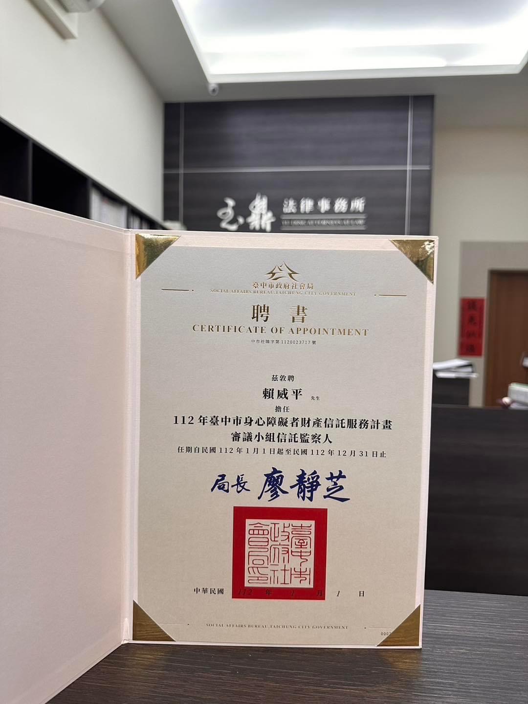 您好~您尚未登入 Home 玉鼎新訊 本所賴威平律師榮幸獲聘臺中市身心障礙者財產信託服務計畫審議小組信託監察人! 返回列表 本所賴威平律師榮幸獲聘臺中市身心障礙者財產信託服務計畫審議小組信託監察人! 2023-03-31 感謝 台中市政府 的信賴與肯定, 本所 賴威平 律師榮幸受聘擔任一臺中市身心障礙者財產信託服務計畫審議小組信託監察人! Share this : 其他文章 日期 標題 2025-04-30 玉鼎所內課程(2025.05-06) 2024-05-01 玉鼎所內課程(2024.05) 2023-08-31 玉鼎所內課程(2023.09) 2021-01-05 玉鼎所內課程(2021.01) 2019-04-01 玉鼎所內課程(2019.04) × 律師介紹 專攻領域 一般民商事件, 刑事事件, 仲裁事件, 保全程序事件, 契約撰擬 建築工程事件, 公司事件, 證券 學歷 日本慶應大學法學部研究 日本名城大學法學碩士 國立政治大學法學士 經歷 寰瀛法律事務所主持律師(1997年6月1日迄今) 中華民國仲裁協會仲裁人(2000年1月1日迄今) 專利代理人(2002年8月14日迄今) 臺灣臺北地方法院所屬民間公證人(2002年12月10日迄今) 中華工程仲裁協會仲裁人(2003年1月28日迄今) 2010年中華民國銀行商業同業公會全國聯合會委託研究計畫「債務清理法草案之研究」計畫協同主持人 2007年11月中央存款保險公司委託研究計畫「委託規劃『銀行清理作業』」首席研究員 2006年1月經濟部委託研究計畫「企業併購法之法制檢討委辦計畫」共同計畫主持人 2005年經濟部委託研究計畫「研擬公平債務催收行為法草案委辦計畫」計畫主持人 2002年4月經建會委託研究計畫「公營事業結束營業或破產時之善後問題研究」研究顧問 大正法律事務所主持律師(1987年6月1日~1997年5月31日) 臺灣臺北地方法院法官(1979年3月1日~1987年5月13日)